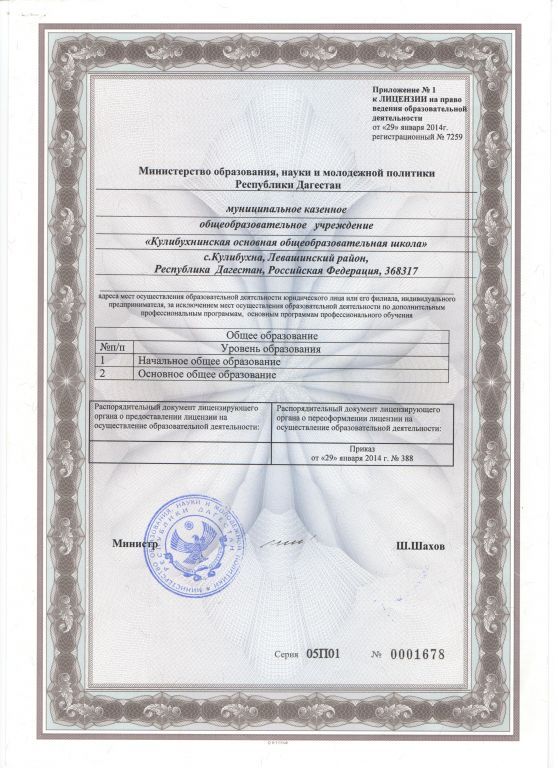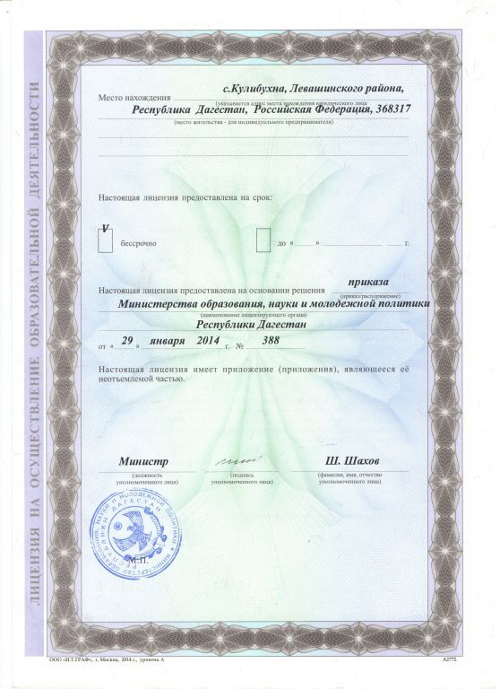 | Адрес местонахождения образовательной организации* | 368317, Республика Дагестан, Левашинский район, с. Кулибухна |